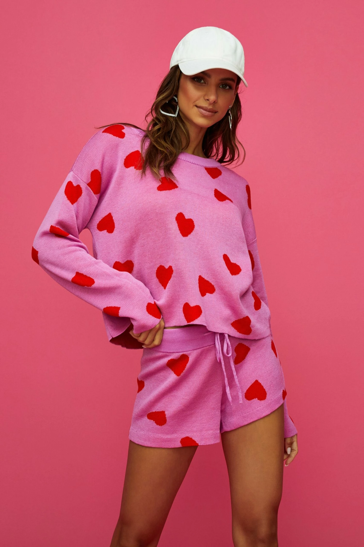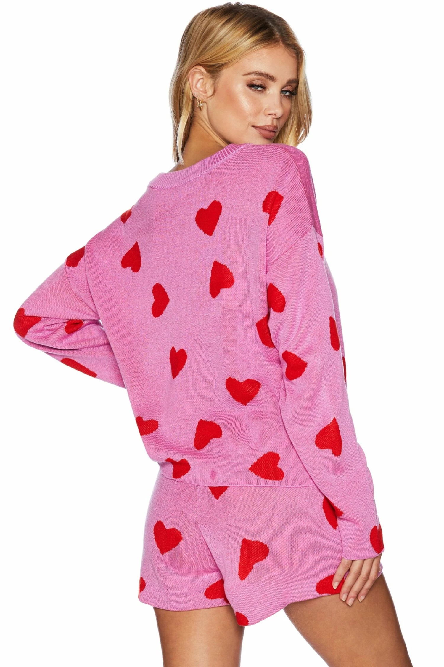 Our popular Beach Sweater is now available in a sweet bubblegum pink with red heart Valentine print. This lightweight sweater is the perfect piece to throw on for a beach cover up or cozy lounge look. Pair this sweater with the Balboa Short in Valentine Heart print to wear as a matching set.