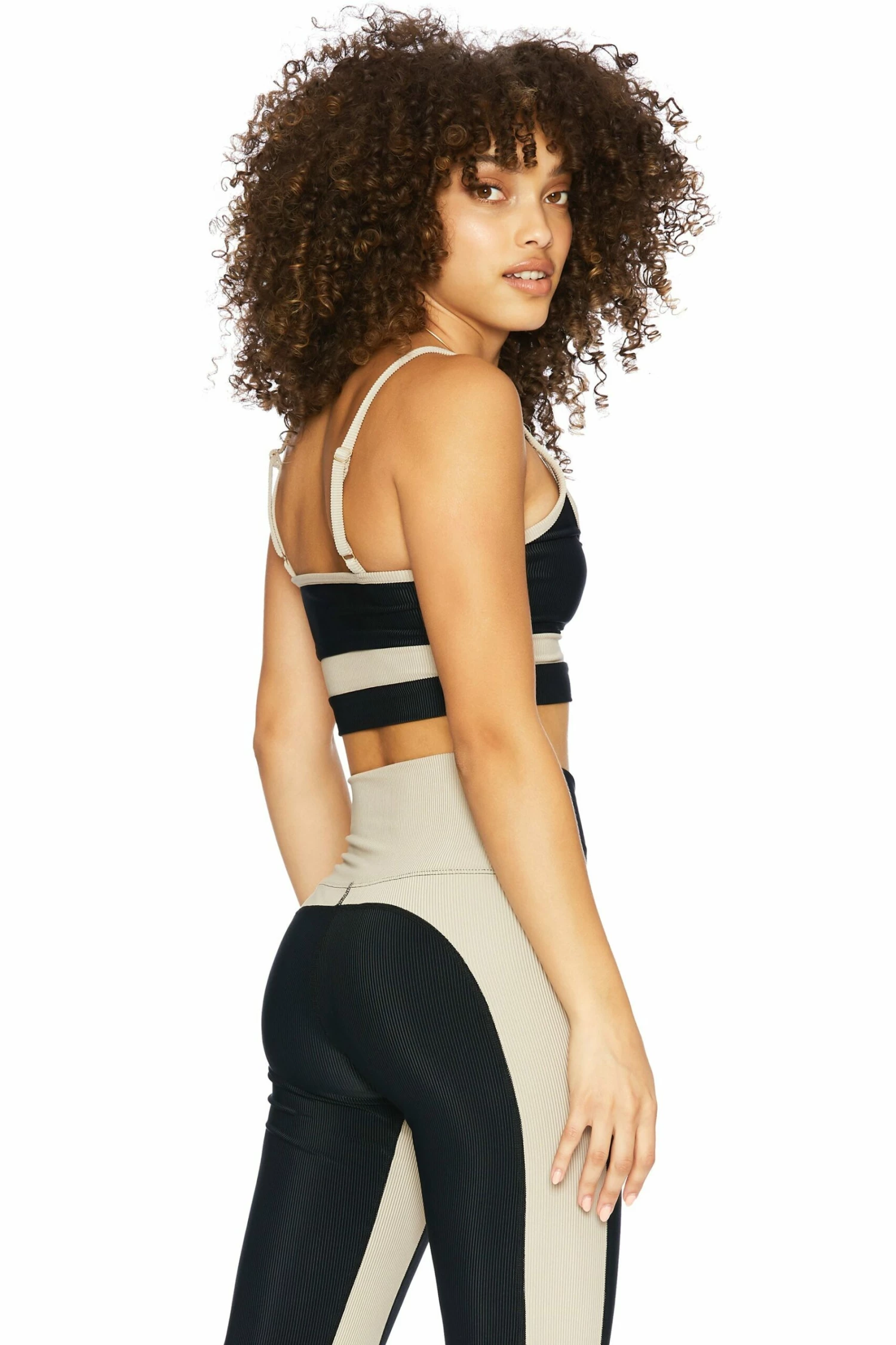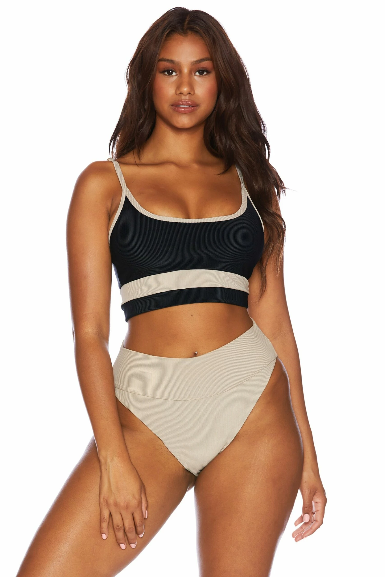 The Eva Top is our best selling now featured in our popular black and tan ultra soft ribbed fabric. Pair with the black and tan colorblocked leggings or wear it with one of our black or tan swim bottoms.Â