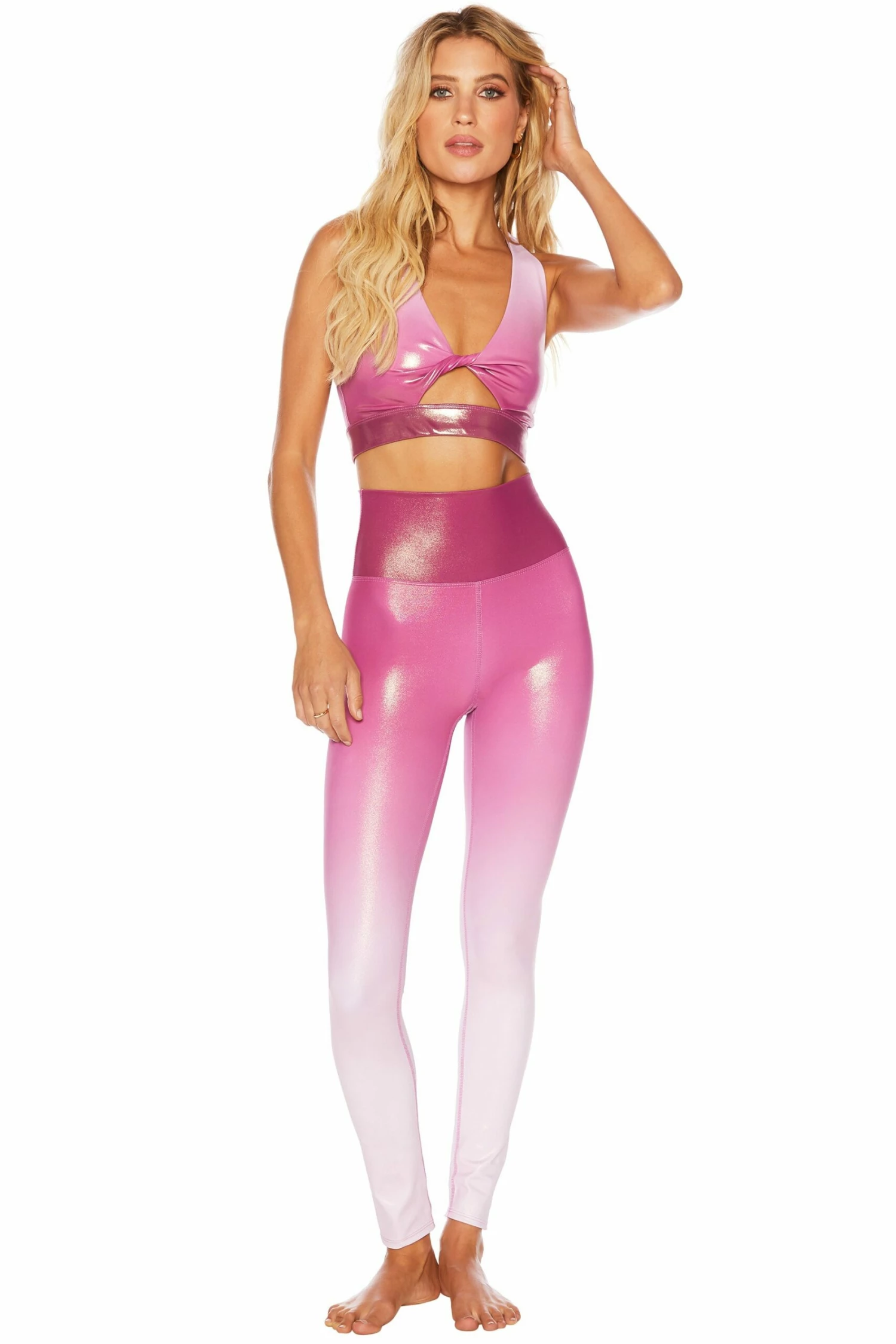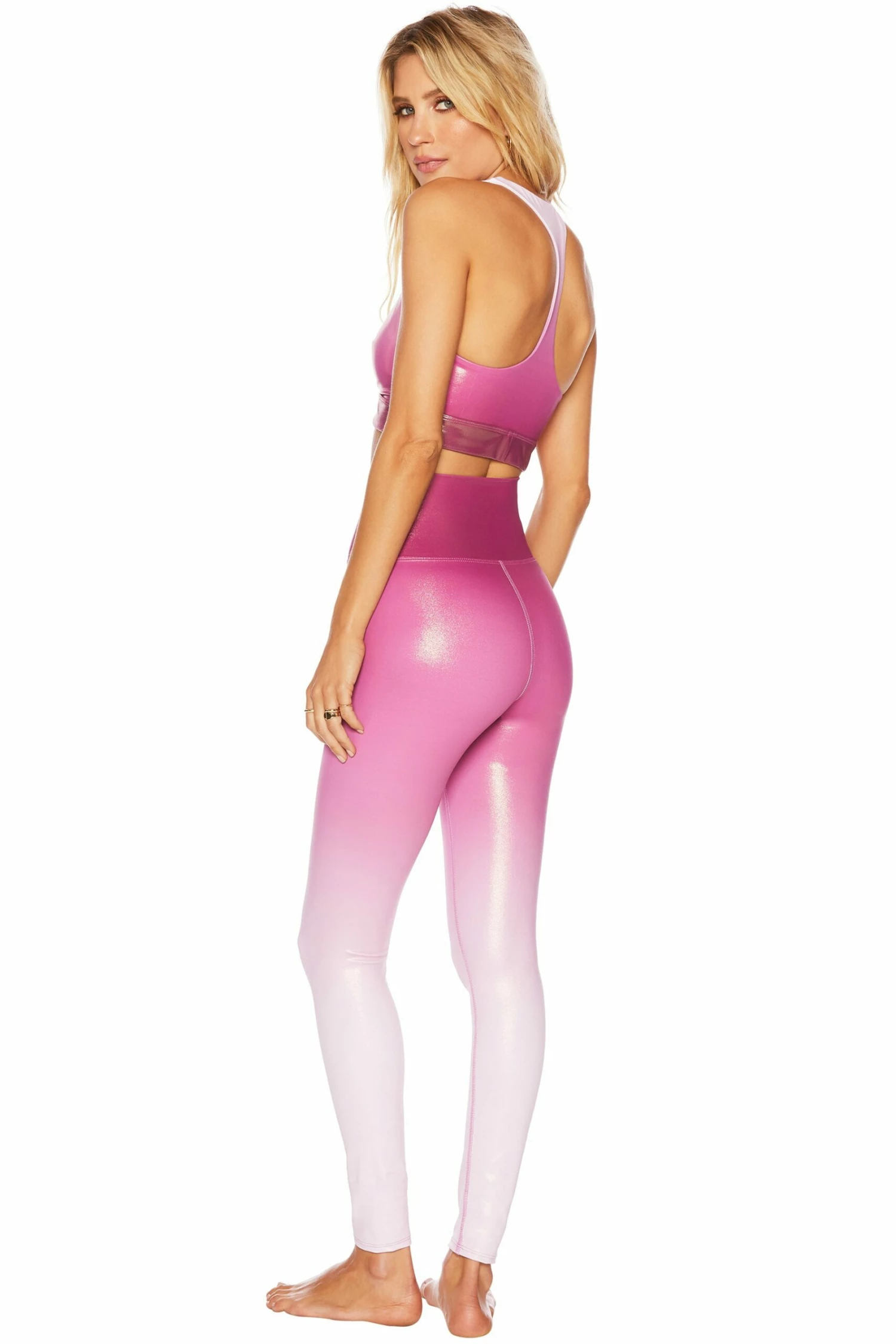The Glitter Piper Legging is our full-length, high-rise active pant in a sparkly pink ombre fabric. Make it a set and pair it with the matching Glitter Twist Top in Baton Rouge Ombre.