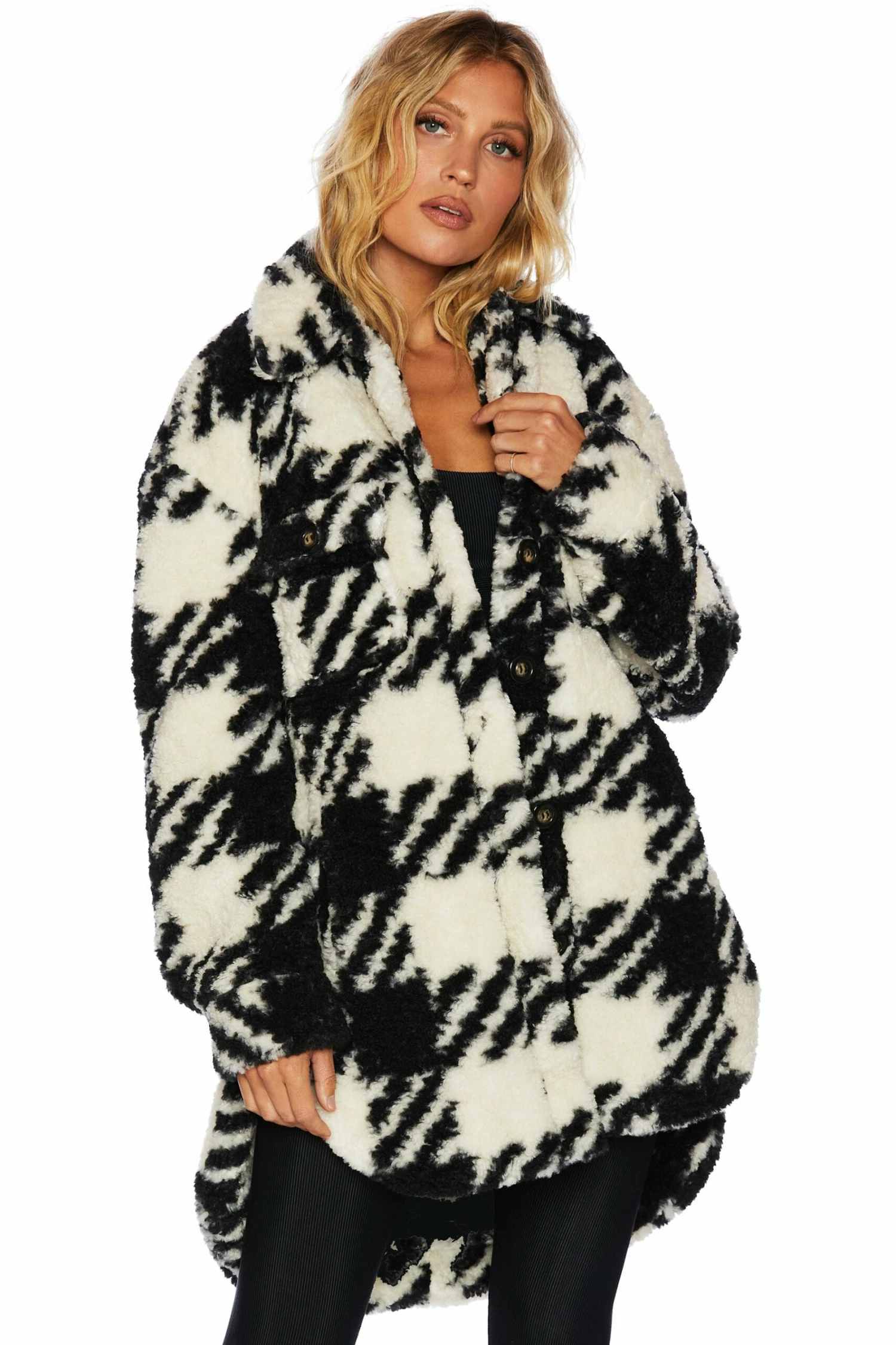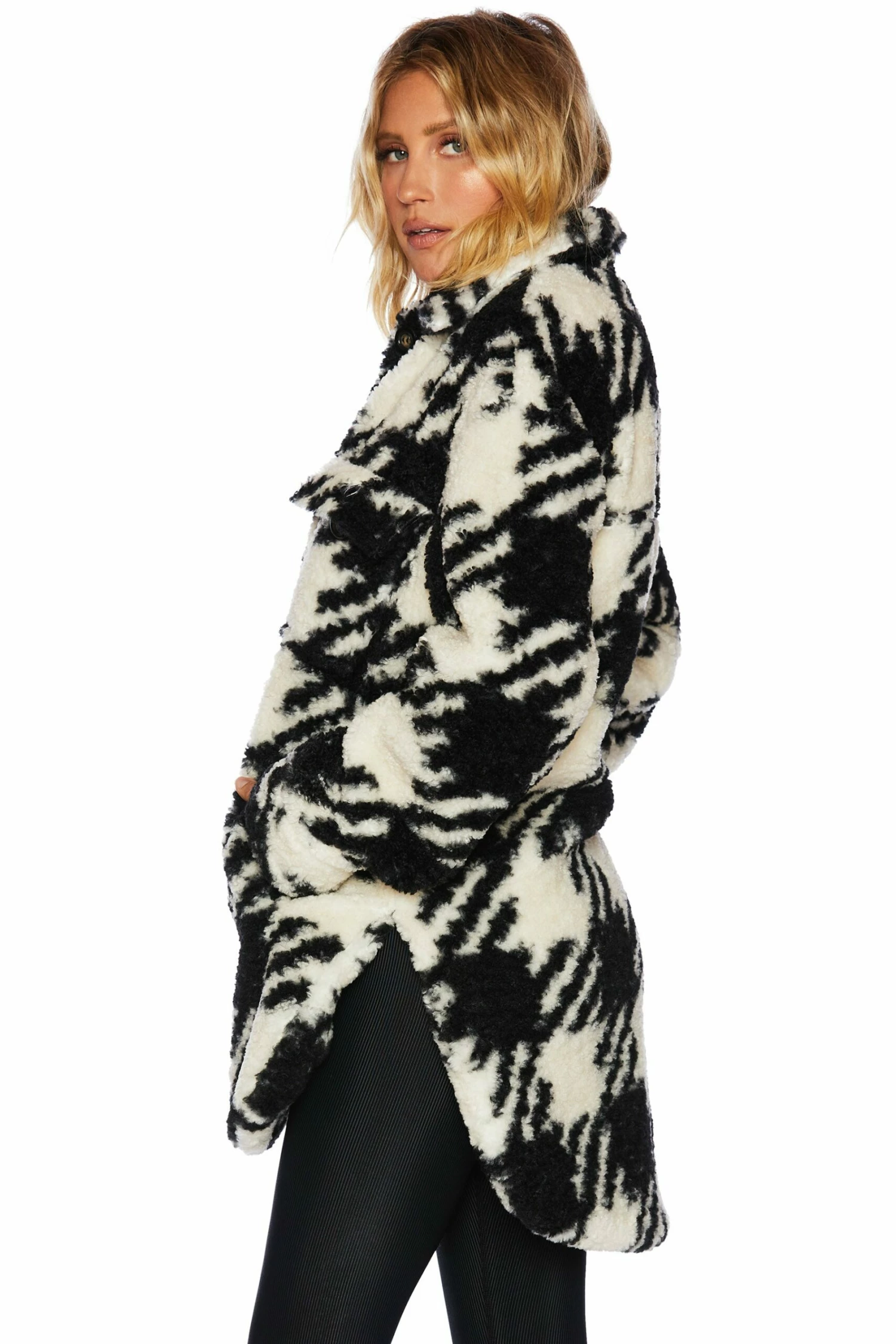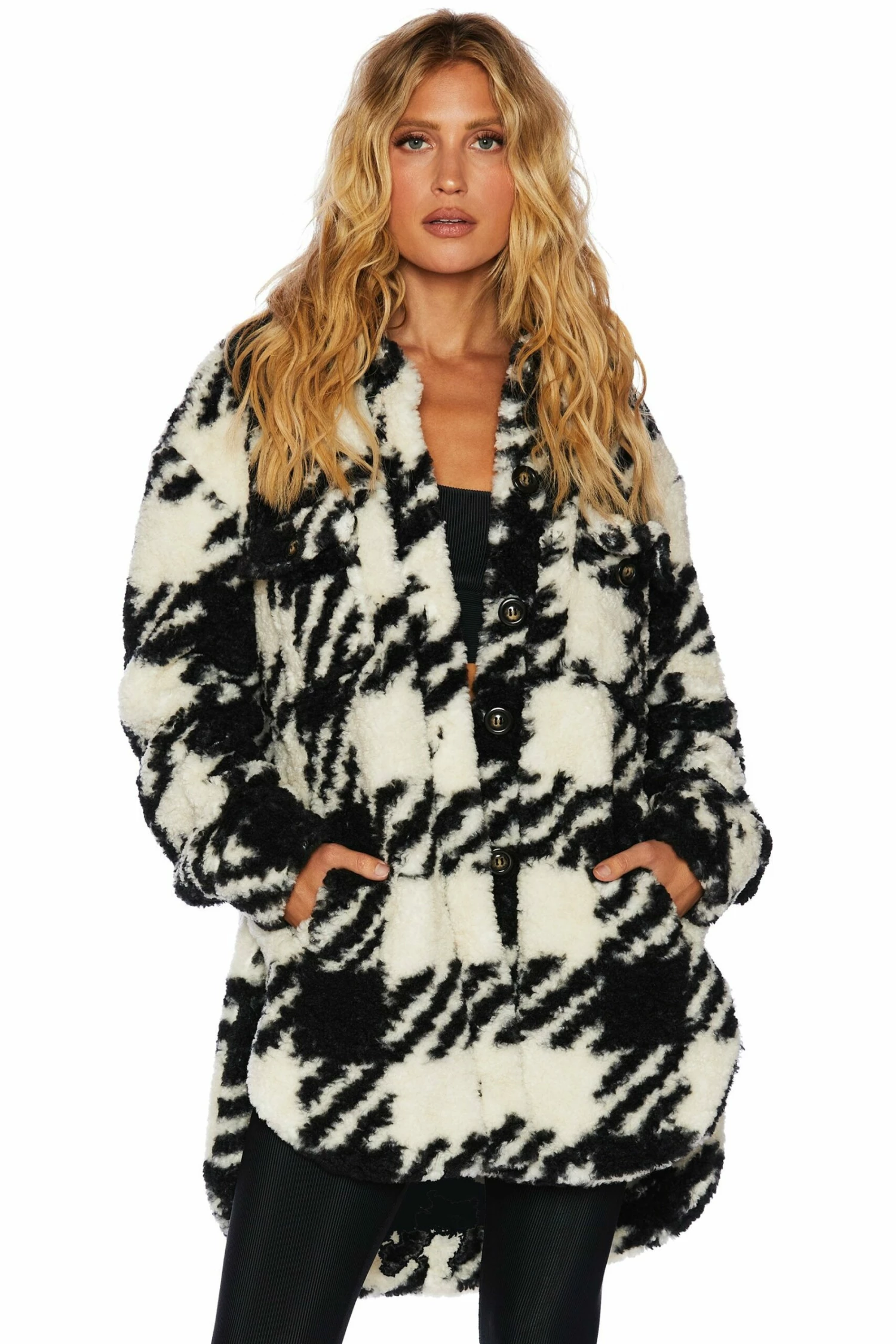 The Ingrid Jacket is a must add to your fall wardrobe. This button up jacket features side pockets and a chic houndstooth print.Â