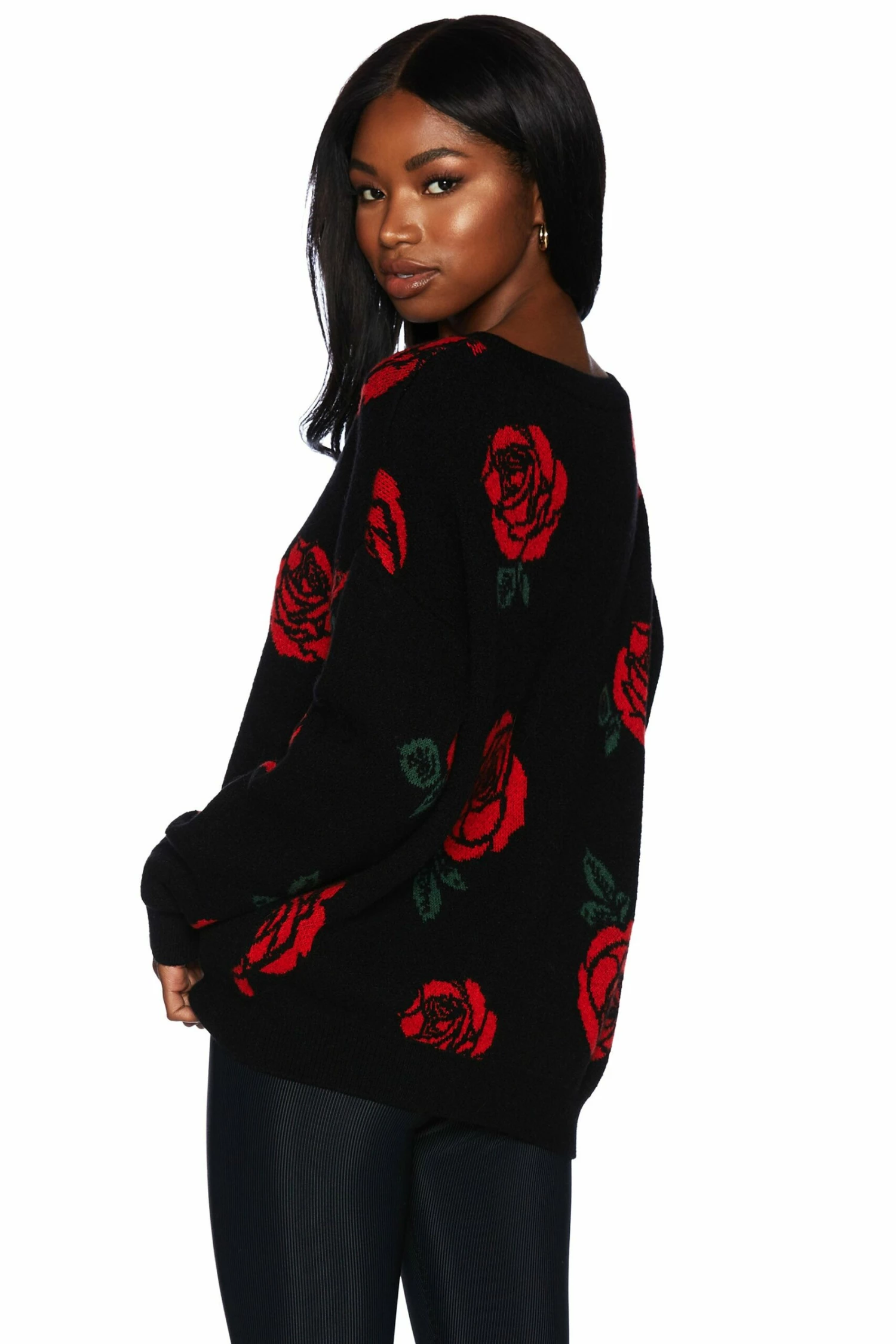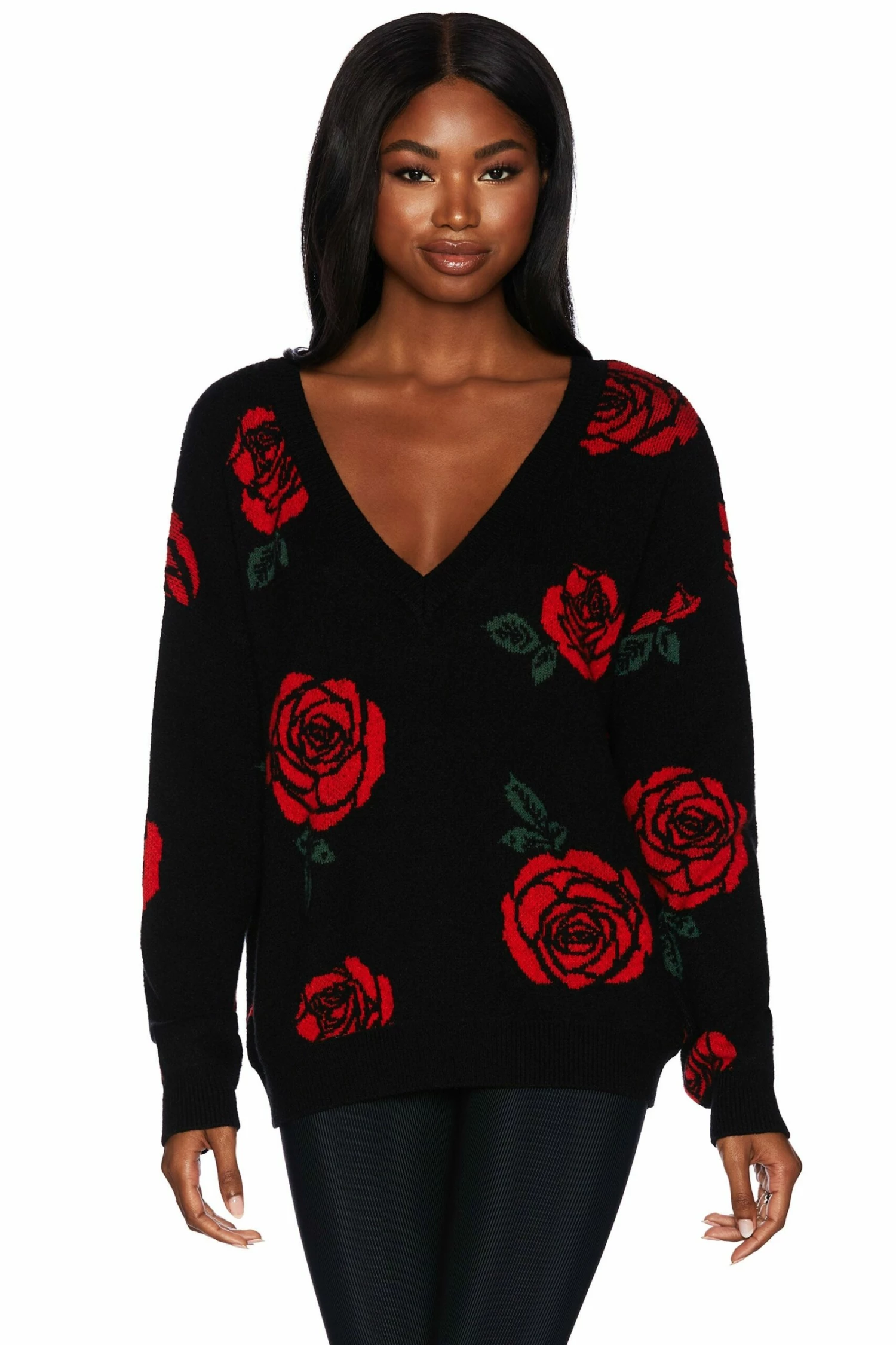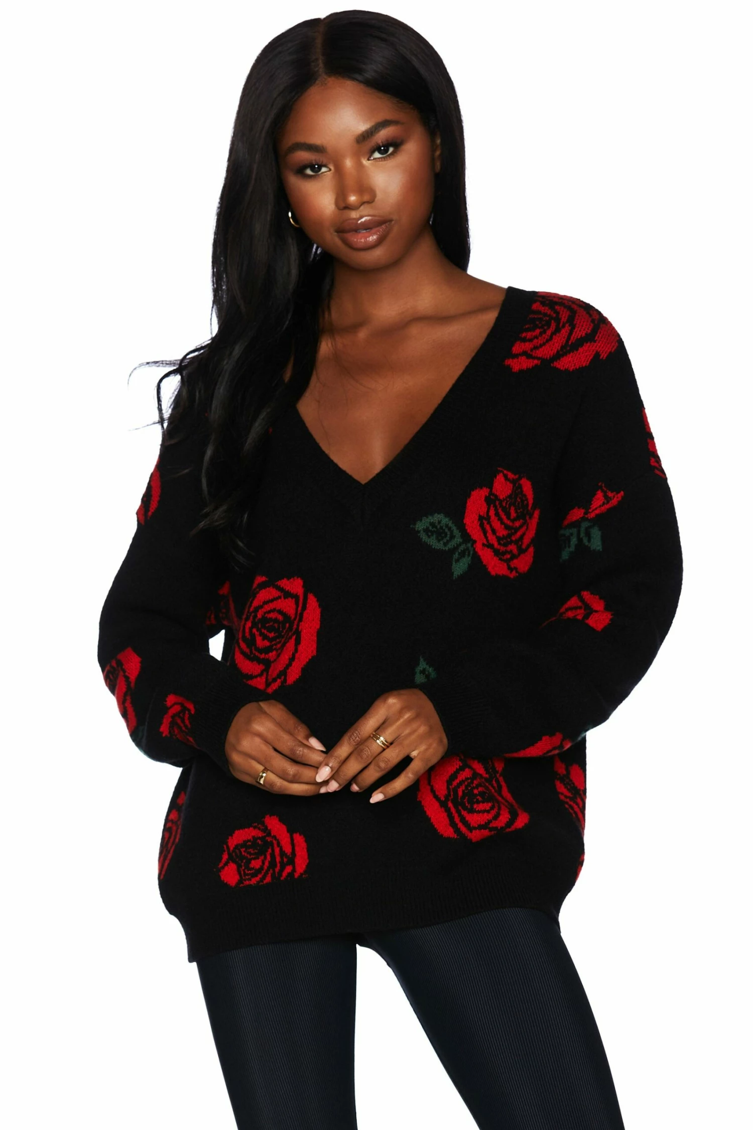 The Joey Sweater is our best-selling ultra soft knitted sweater now featured in black with a red rose print. Pair this sweater with one of our leggings or your favorite pair of jeans.