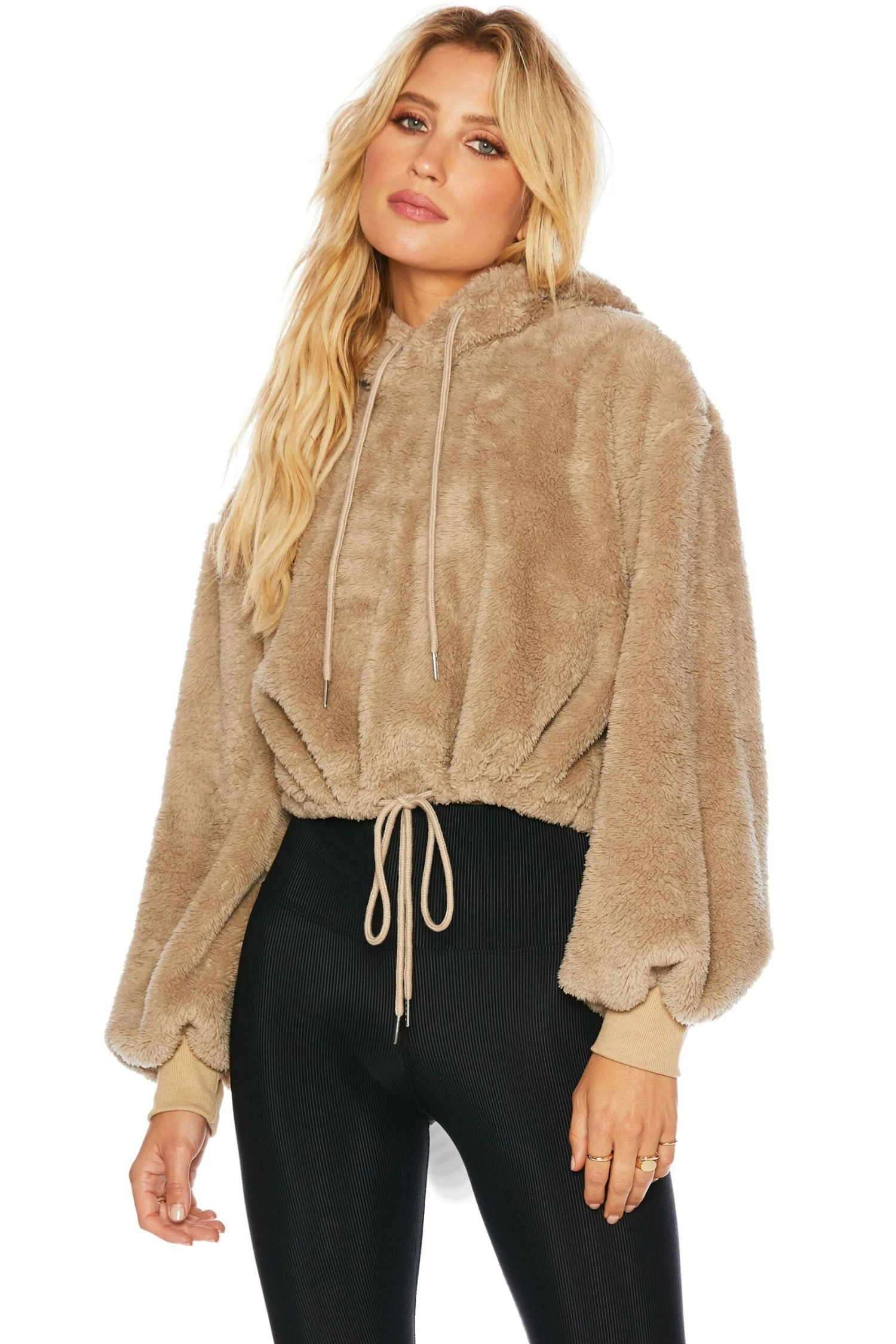 The Shayla Sweatshirt is our new fuzzy hooded sweatshirt that features drawstrings, an adjusted cropped fit with bell cuffed sleeves. The perfect addition to your fall wardrobe.Â