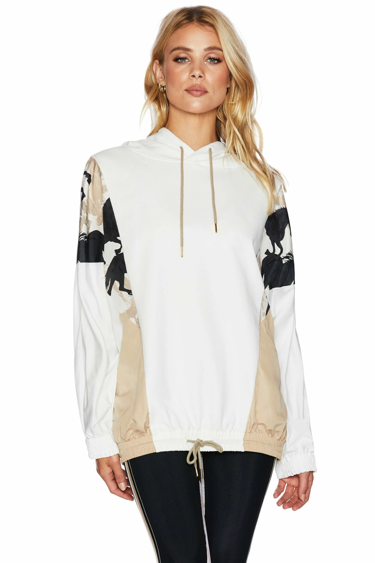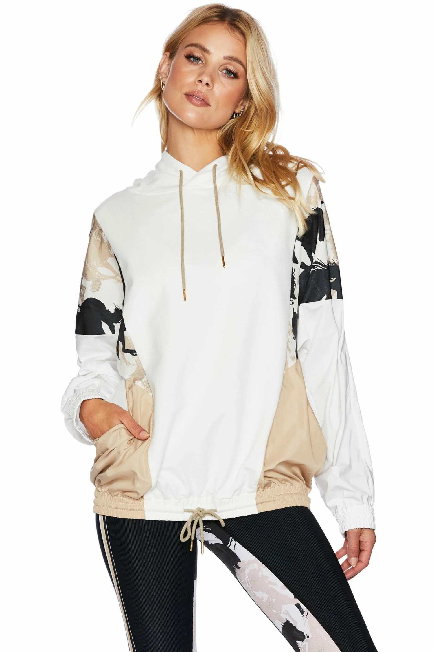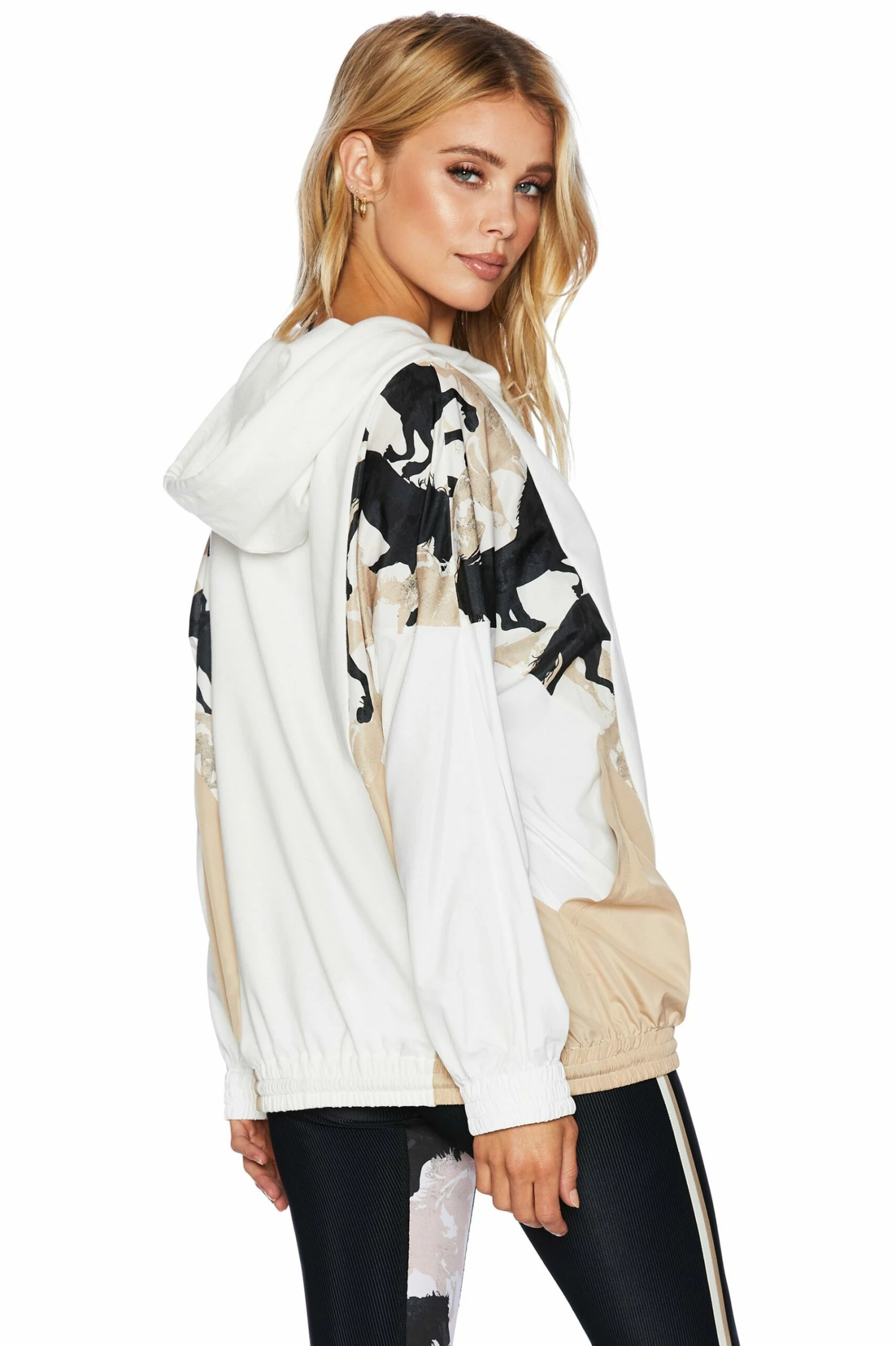The Stella Popover is our new pull over jacket in our new Taupe Horse print. This hooded jacket features large pockets and drawstrings with cotton paneling on the hood and down the front and wind breaker material on the sleeves and sides of the jacket. Pair with the matching Posey Leggings or Bike Short in Taupe Horse for a stylish streetwear look.