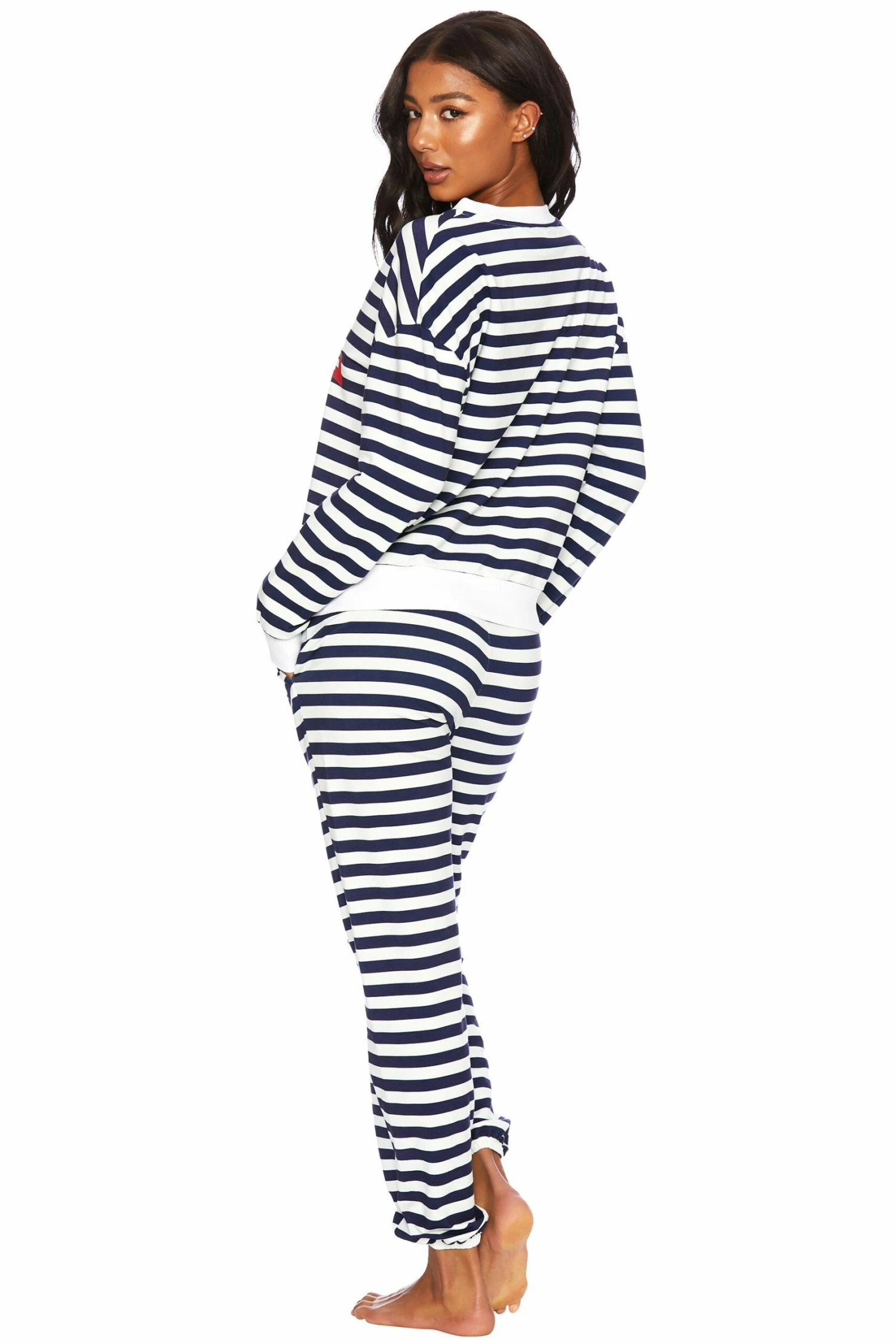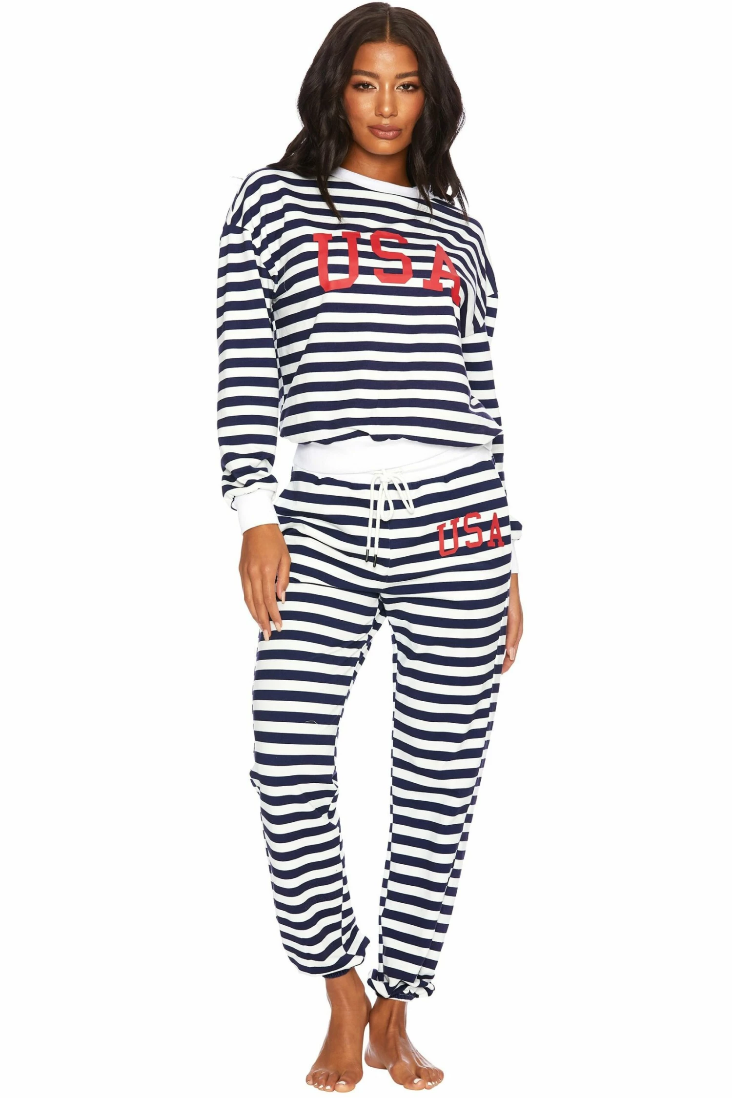 Our high rise cotton sweatpants feature a classic banded hem fit with side pockets and a drawstring waist. Now in navy and white stripes with a red USA printed on one side. Pair these with the matching USA Sweatshirt or one of our sports bras for a chic street wear style.Â